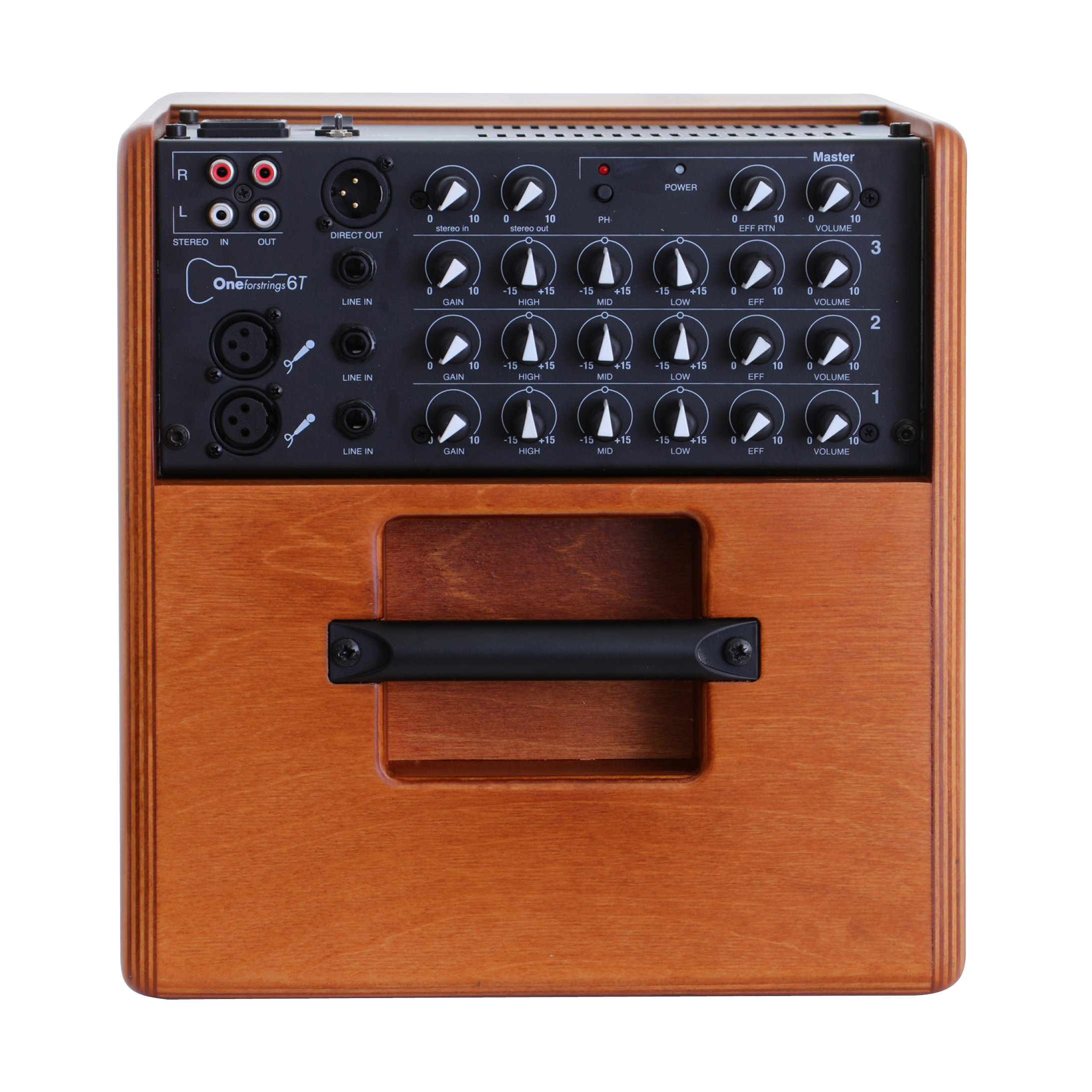 - Eingänge: 2x 6,3 mm Klinke + XLR (Kanal 1+2), 6,3 mm Klinke (Kanal 3), 3,5 mm Klinke (Aux-In)