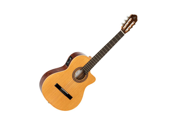 4/4 Konzertgitarre mit TonabnehmerSpezifikationen:Größe: 4/4mit CutawayDecke: kanadische western red Zeder massivBoden & Zargen: MahagoniHals: MahagoniGriffbrett: PalisanderSteg: SonokelinSattel- & Stegeinlage: KunststoffBindings: EchtholzMensur: 650 mmSattelbreite: 52 mmMechanik: vergoldetTonabnehmer: Ortega Magus Pro mit eingebautem TunerFarbe: Natur mattinkl. Gigbag